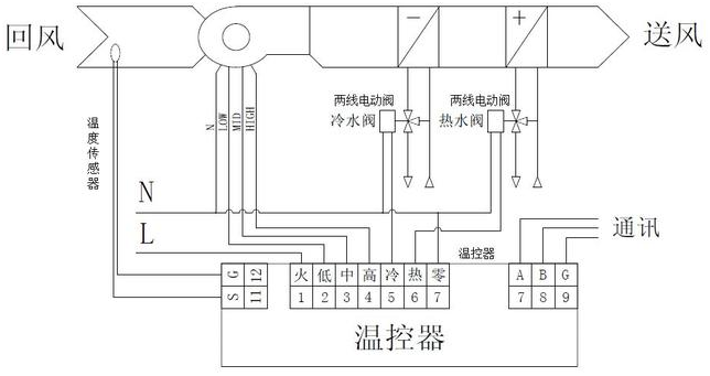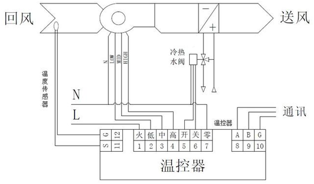 四管系統(tǒng)包括兩個獨立的冷卻水和熱水熱交換裝置。冷水閥系統(tǒng)打開用于冷卻,熱水閥系統(tǒng)打開用于加熱。溫度控制器實時檢測室溫并將其與設(shè)定溫度進(jìn)行比較,根據(jù)比較結(jié)果控制電動閥的開關(guān),從而保持室溫處于穩(wěn)態(tài)。