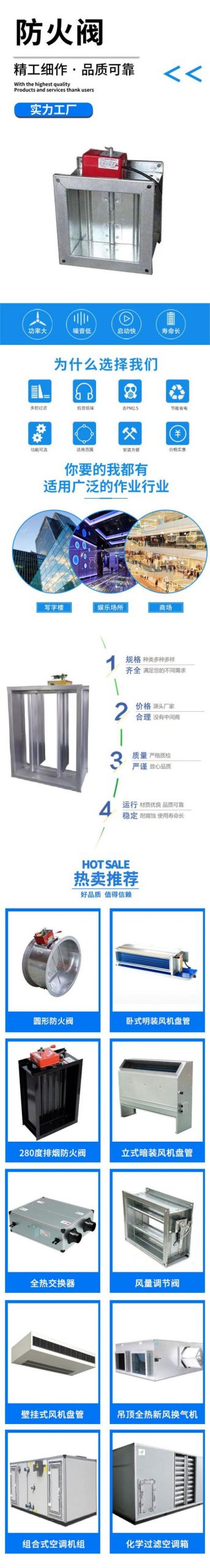 防火閥按其功能可分為:排煙閥、排煙防火閥、防火調(diào)節(jié)閥、防煙防火調(diào)節(jié)閥等多種結(jié)構(gòu)。